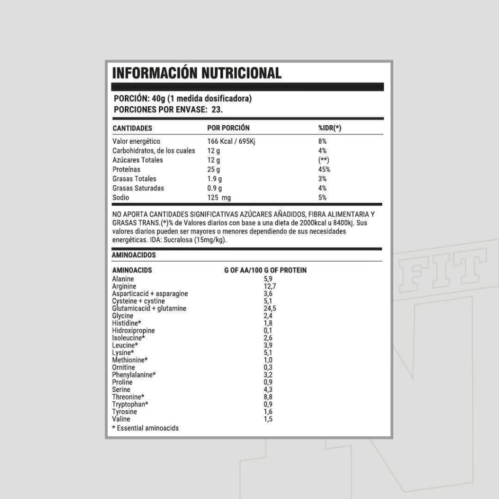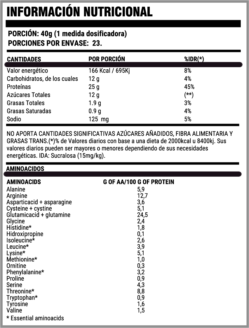 Cada porción aporta 25 g de proteínas de alta calidad, junto con aminoácidos clave como L-Leucina, L-Isoleucina, L-Valina y Glutamina, fundamentales para estimular la síntesis proteica y favorecer la reparación muscular.