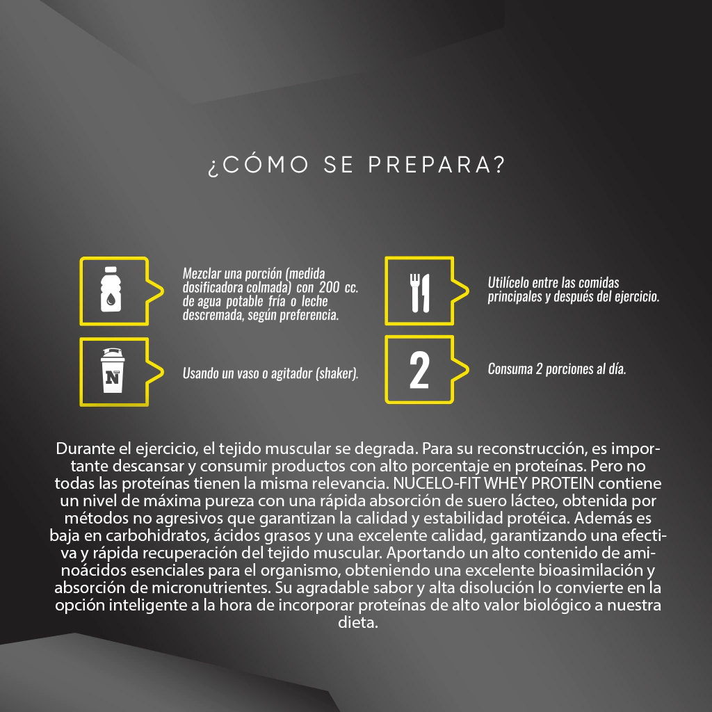 Gracias a su excelente perfil nutricional y biodisponibilidad, Whey Protein de Núcleo Fit es el aliado perfecto para complementar tu dieta, alcanzar tus objetivos fitness y potenciar tu rendimiento.